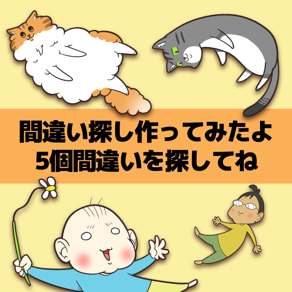 2026年新年のご挨拶と間違い探し 2026 1/26 2026年 日常 猫 赤ちゃんと猫 2026年1月13日2026年1月26日 分かりましたか? まあまあ良くできたのでは? こんな家族ですがよろしくお願いいたします。 答えは↓ 2026年 日常 猫 赤ちゃんと猫 2026年 午年 挨拶 新年 猫 間違い探し よかったらシェアしてね! URLをコピーしました! URLをコピーしました! 2023年漫画ブログ 1話から15話 この記事を書いた人 テル子武 在宅ワーク中の主婦です。 長年勤めた会社は、出産をきっかけに卒業。 ちょっぴり惰性な性格の私ですが、猫たちに尻を叩かれて、なんとか人間として成長中です。 現在は、猫2匹+夫+息子のにぎやかな5人家族。 そんな毎日のドタバタを、漫画ブログでゆるっと紹介しています。 関連記事 2024年漫画ブログ 349話から363話 2026年2月21日 2024年漫画ブログ 334話から348話 2026年2月21日 2024年漫画ブログ 319話から333話 2026年2月21日 2024年漫画ブログ 304話から318話 2026年2月20日 2024年漫画ブログ 289話から303話 2026年2月14日 2024年漫画ブログ 274話から288話 2026年2月14日 2024年漫画ブログ 259話から273話 2026年2月14日 2024年漫画ブログ 244話から258話 2026年2月14日 コメント コメントする コメントをキャンセルコメント ※ 名前 ※ メール ※ サイト 次回のコメントで使用するためブラウザーに自分の名前、メールアドレス、サイトを保存する。 Δ